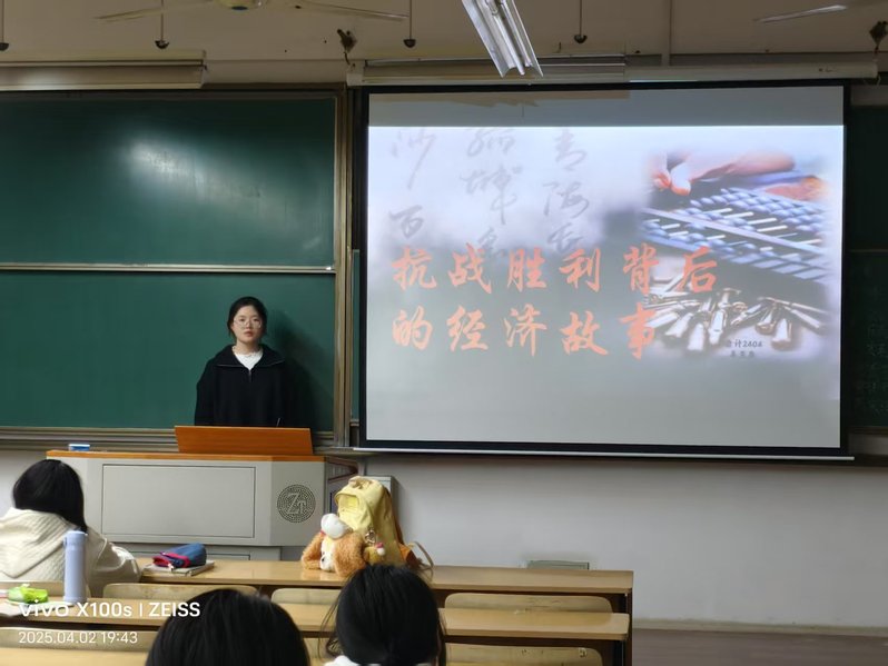决赛现场,选手们紧扣“抗战胜利的经济密码” 主题,生动诠释历史事件。会计2404 班姜昱辰同学以“抗战时期的货币战争” 为切入点,通过详实的数据对比分析法币政策对经济稳定的作用;金融2401班陈婷婷同学则聚焦“大后方的工业迁徙”,强调战时经济布局对持久抗战的支撑作用......选手们既展现了扎实的专业素养,又传递了深厚的家国情怀,经过激烈角逐,会计2404 班姜昱辰、会计2405 班张玖婷两位同学斩获一等奖,会计2402班尚思彤等3同学获二等奖。